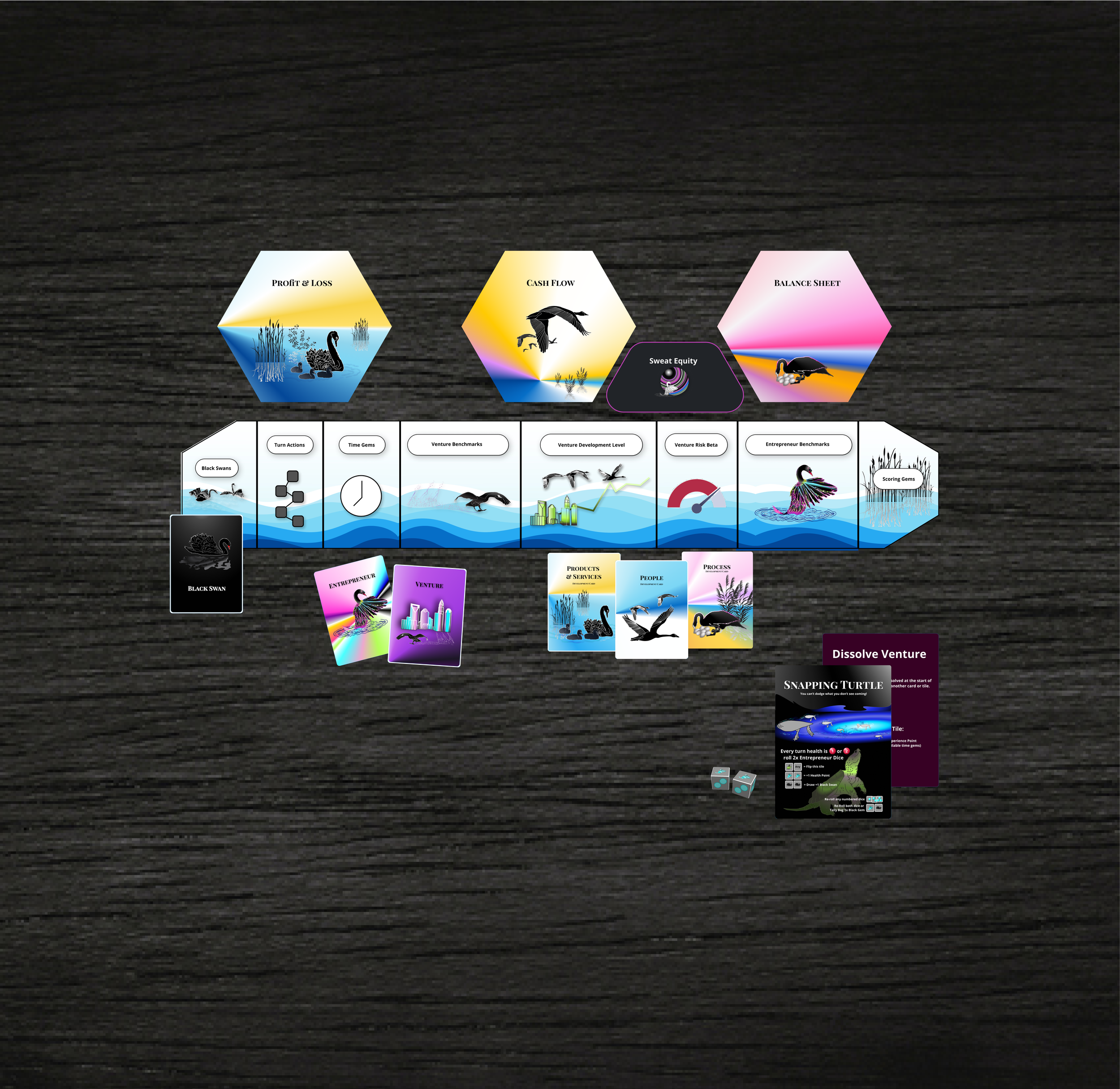 In Don’t Anger the Swan each player is an Entrepreneur running a random business. Every turn is an adventure where players: